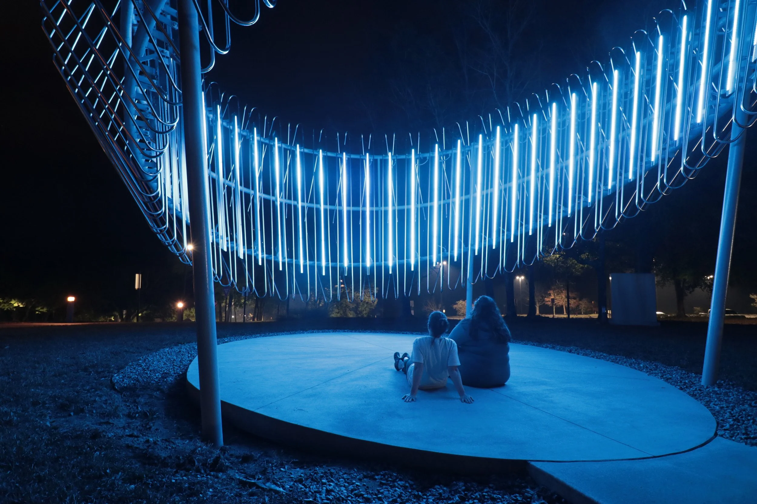 Constellations is located between the Center for Fine and Preforming Arts and the Hal Marcus College of Science and Engineering at the University of West Florida in Pensacola Florida. It anchors the landscape between the STEM disciplines on campus and creates an open ended framework for dialogue between the arts and the sciences. Part performance space and part data visualization device, Constellations creates the gathering space for the dialogue of different disciplines and information.
