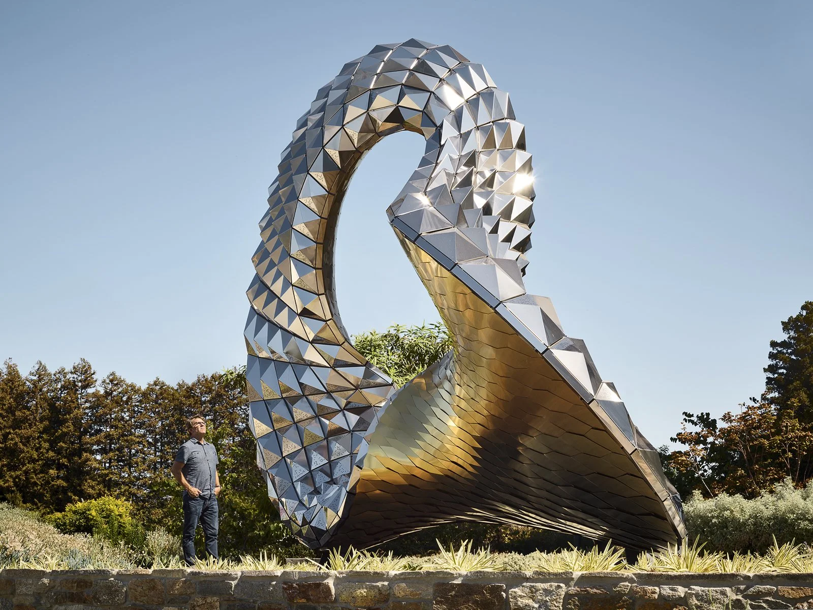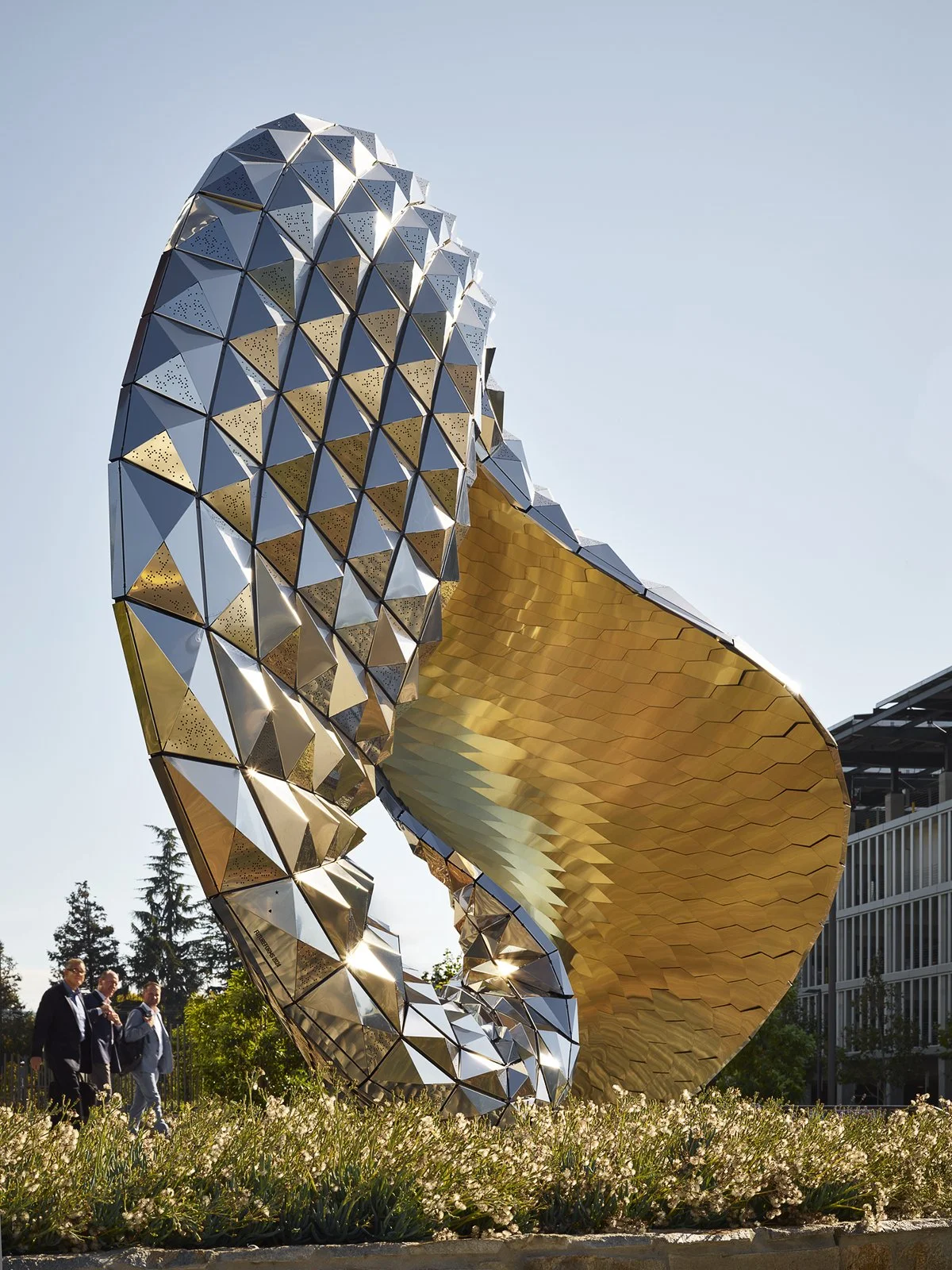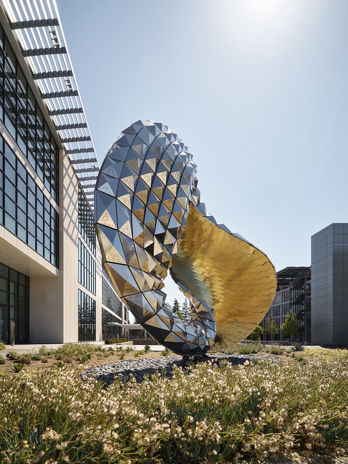 The sculpture is constructed out of faceted stainless steel panels and gold titanium nitride coated shingles. The double-curved surfaces transform from convex to concave curvature. This produces various visual effects with the convex surfaces collecting light and color from their surroundings, and the concave surfaces holding dark shadows as the day progresses.