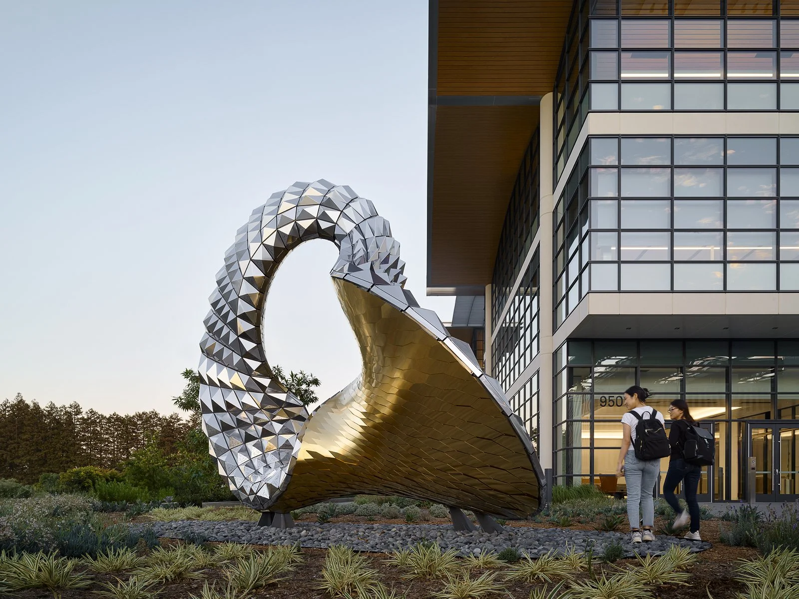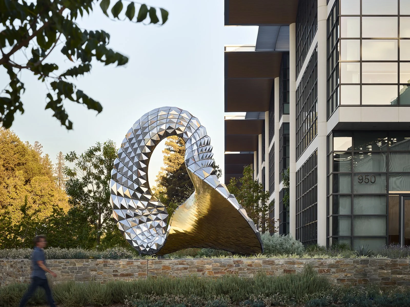 Nestled in a garden of succulents and agaves, Continuum is a site specific sculpture activated by the environment and people walking, biking and driving past it. From certain angles the panels and shingles produce dynamic visual effects in response to viewers movements. Viewed from various positions and at differing speeds, the artwork animates the site in unique ways both day and night. Similar to a möbius loop, the overall form was generated by joining two continuously interconnected double curved surfaces around a central opening or portal. The twisted inner golden surface is smoother with a more reflective, higher resolution shingled appearance, while the outer silver surfaces are faceted and modular. The overall form of the sculpture and twisting central portal is unstable and appears to dynamically evolve depending on the position of the sun and the viewer.