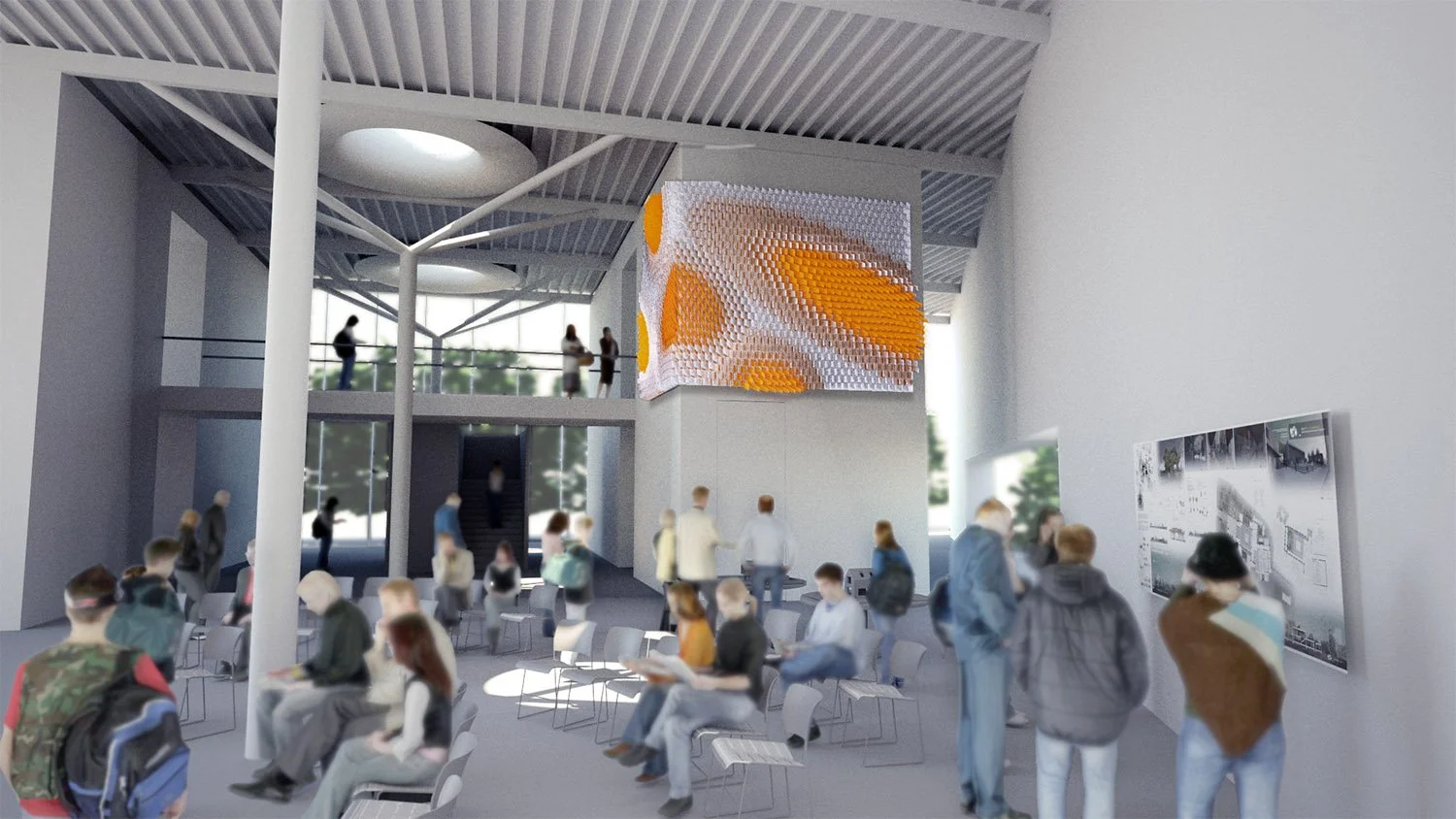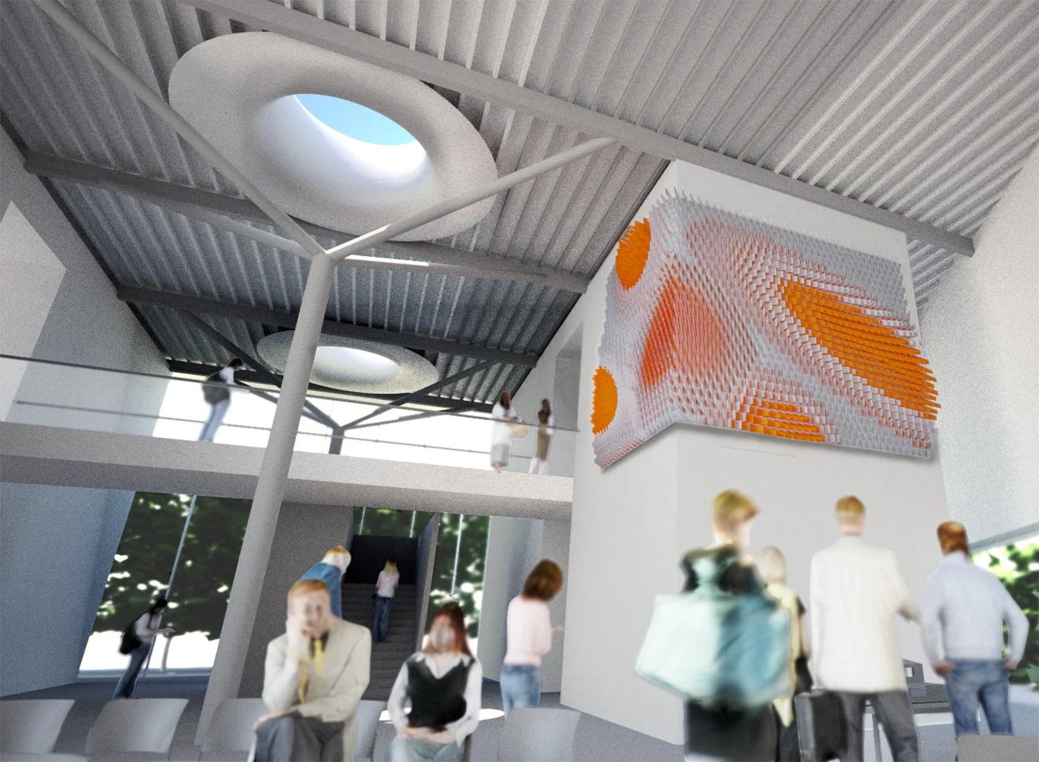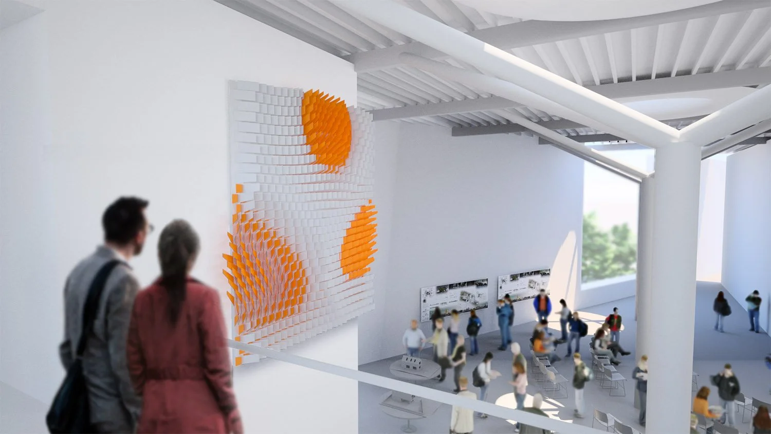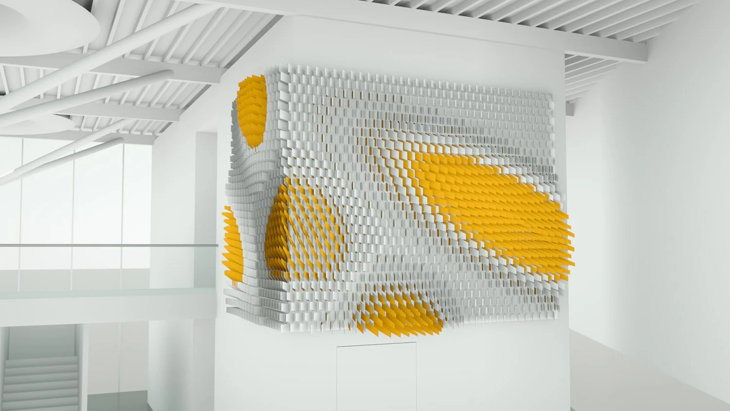 Defined by shadow, light, sound, and human interactions, the wall-mounted sculpture captures the interplay of these dynamic forces in a repetition of aluminum fins. Each bi-color fin expresses a different value through its rotation and length, creating the illusion of depth and softness. These subtle changes create dramatic visual effects - smooth and turbulent topographies that vary as one moves around the piece, or experiences it from above. The result is an ever-changing installation for the passer-by.