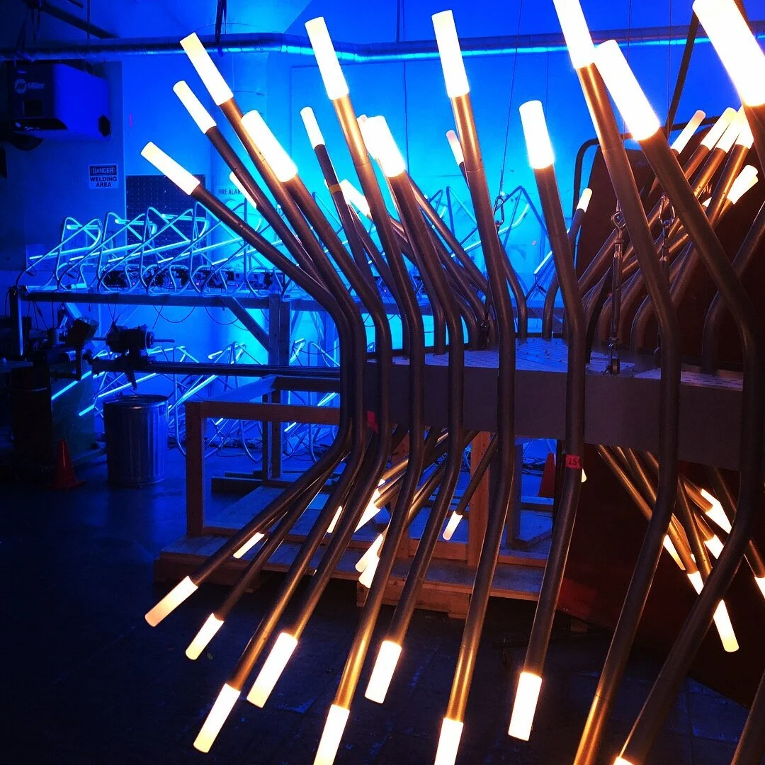 The Nebula Chandelier is a dramatic formation of diffuse light points suspended in a theater lobby. Situated so it can be seen from below and above, the organic form encourages visitors to move around and under its sculptural form and view it from different vantage points.
