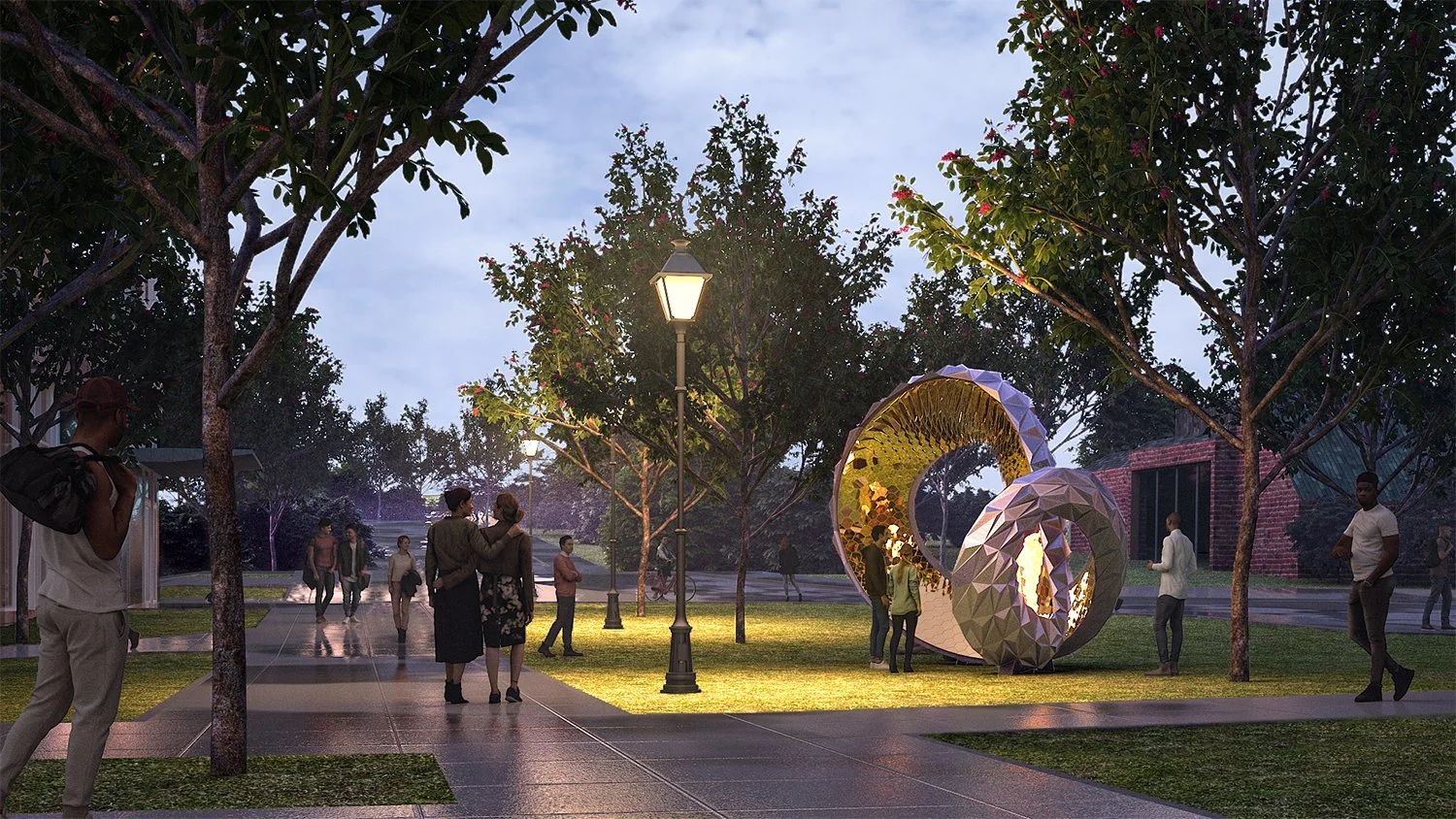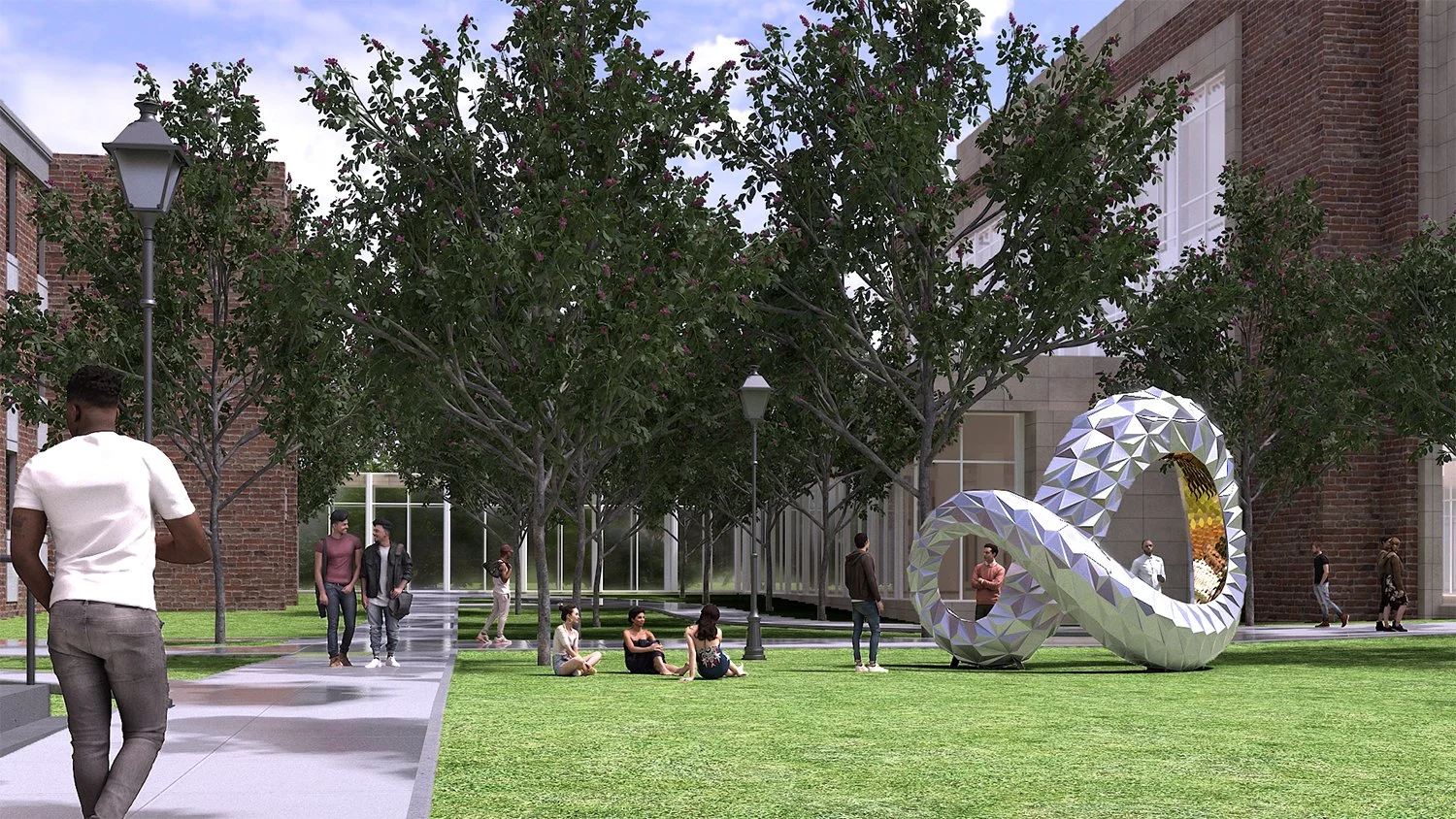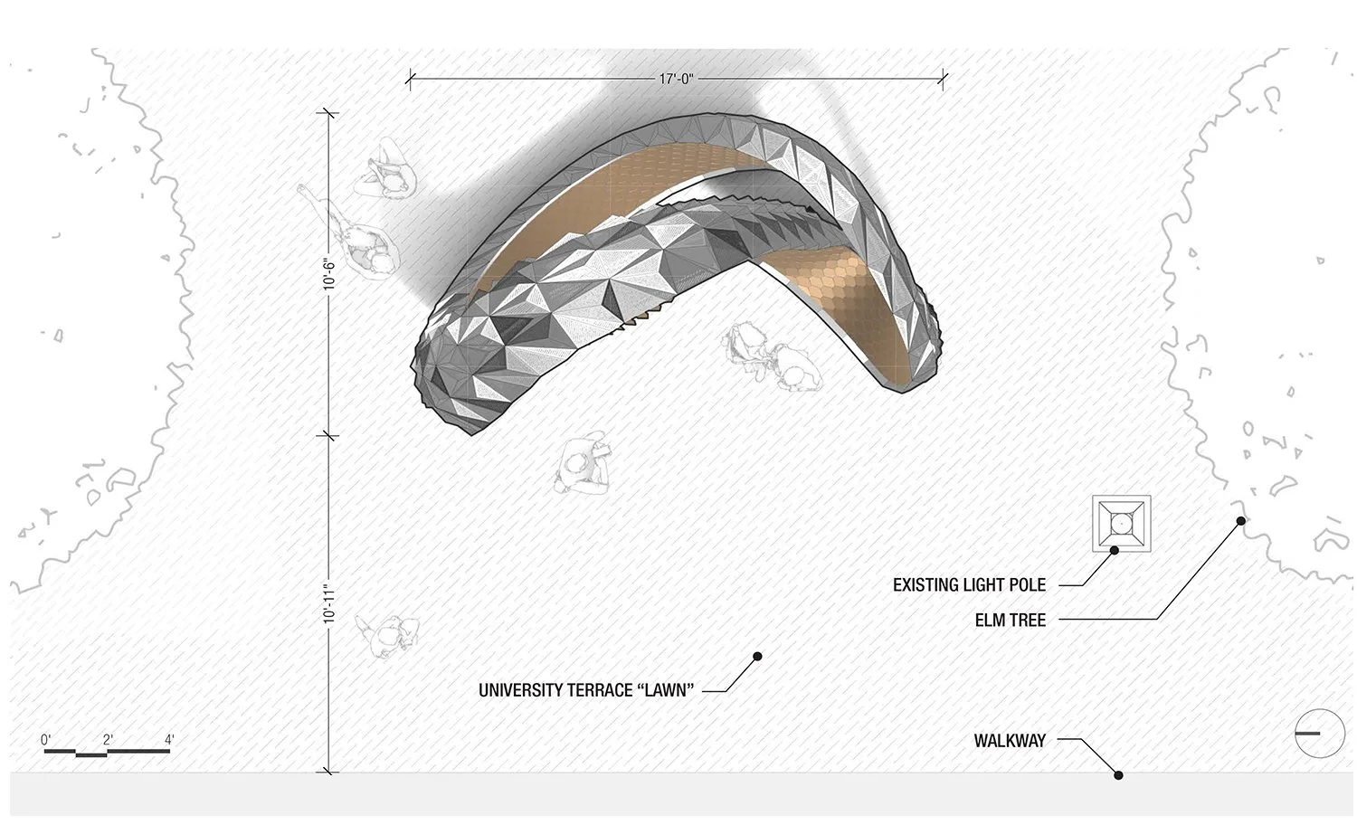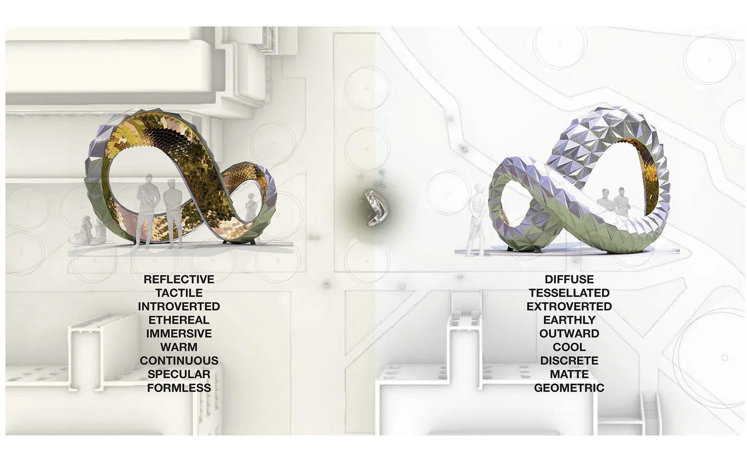 Rhea is an artwork that engages the context by weaving into the pathways of peoples’ daily routes. Sometimes a moment for pause, a quick check-in with a friend, or a selfie picture reveals the multifaceted material experiences of the two surfaces. The kaleidoscopic effects of the tessellated skin create multiple experiences, some cool, geometric and mysterious, and others warm, inviting, reflective and playful.