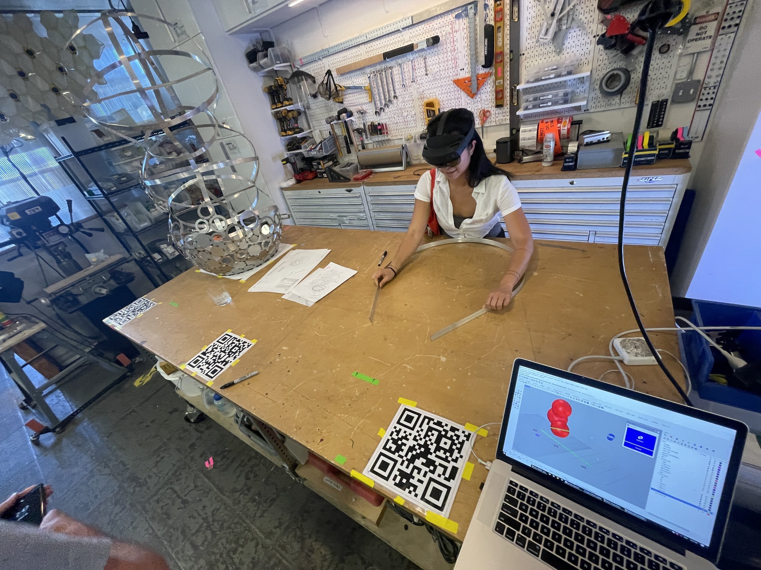 Using QR markers and Fologram we were able to easily place, visualize and manipulate our 3d model in full scale on our shop table to create jigs and verify our forms: we used layers of those digital models to layout, measure, tag, cut, drill, bend materials; and finally place and rivet them together them in physical space.